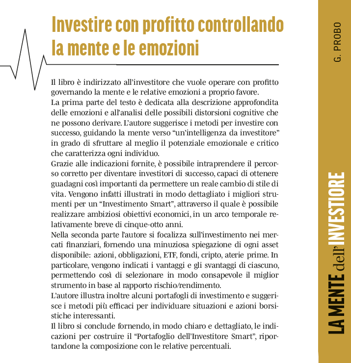 Il libro di Probo affronta tutte queste tematiche, aiutando il lettore a comprendere gli aspetti tecnici ed emozionali del trading e permettendo di migliorare l'approccio ai mercati finanziari grazie alla puntuale esposizione di quelle dinamiche strategiche e psicologiche che l'autore stesso utilizza nel suo trading quotidiano.